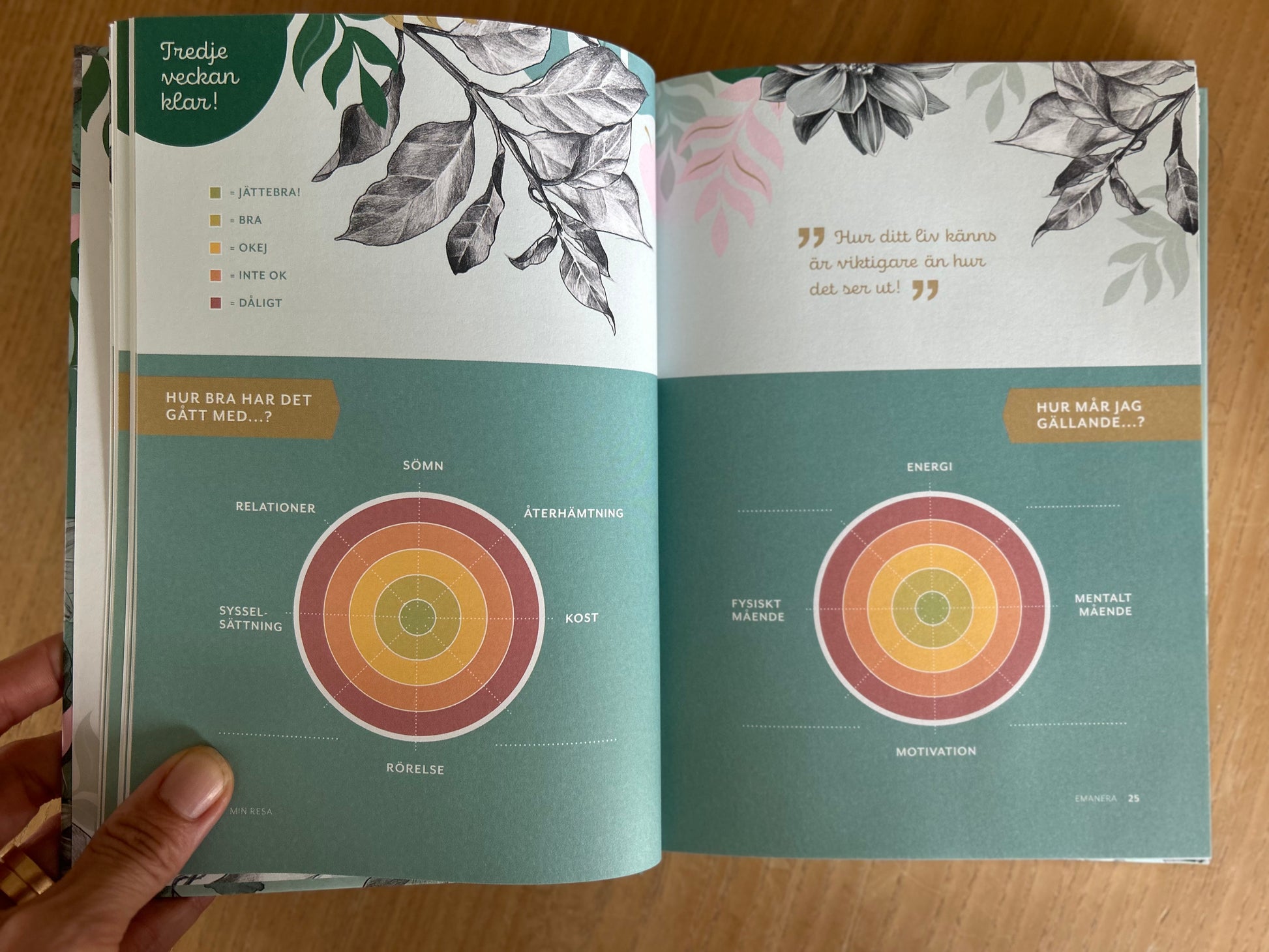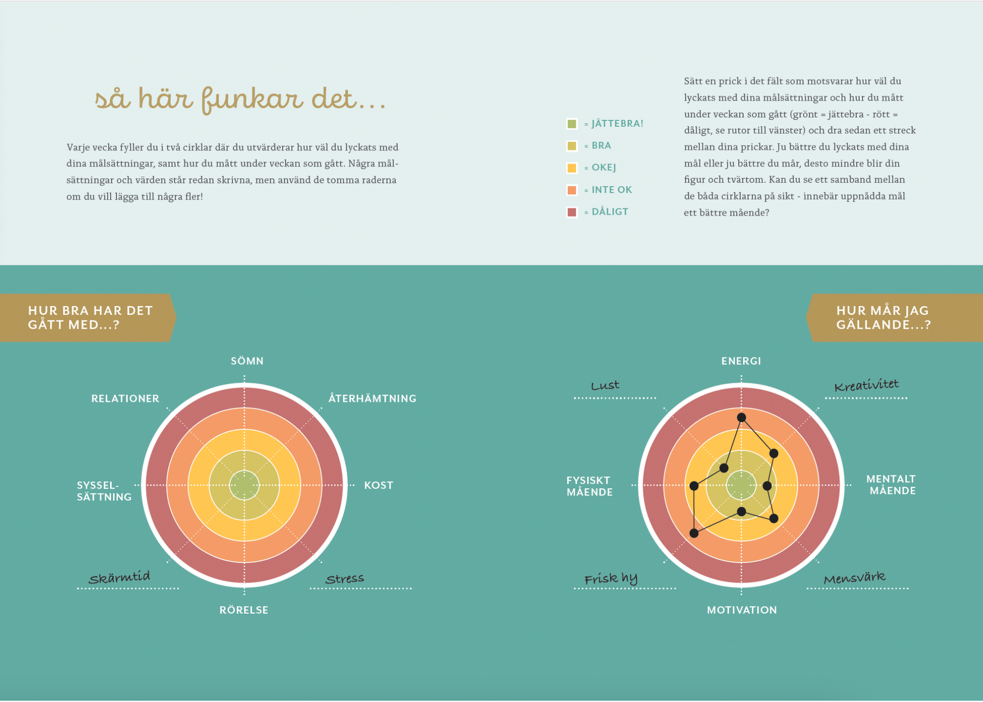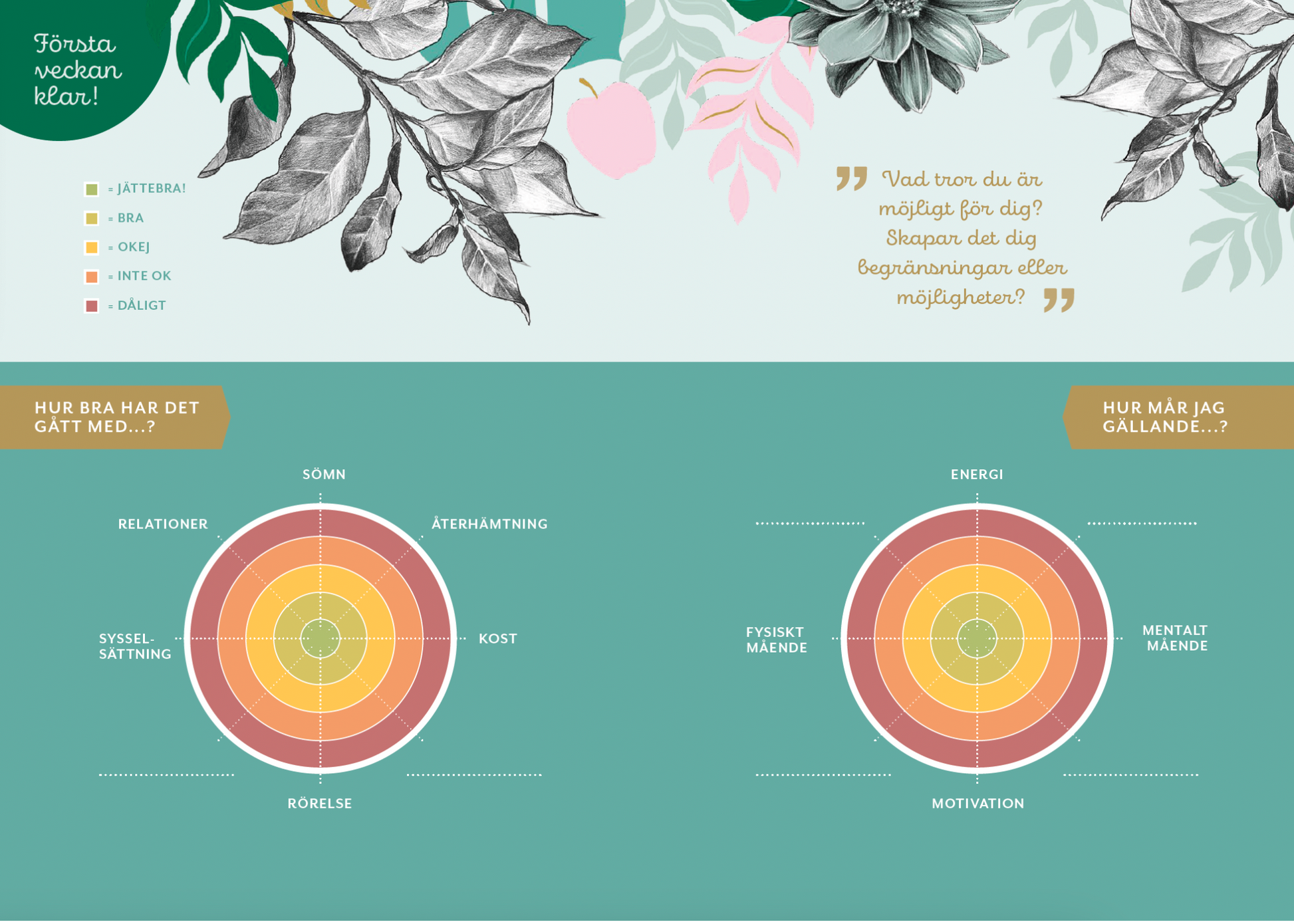 ✔ Reflektionssidor – skriv ner insikter, hinder och framgångar för att lära känna din kropp och dina behov.